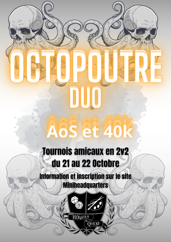 Le 21 et 22 Octobre 2023 va se tenir un tournoi de Warhammer 40000 et Age Of Sigmar en duo à Teyran (34), juste à côté de Montpellier. Ce tournoi est organisé par l’association Hérault Quest dont je remercie l’équipe, et plus particulièrement Alban, de m’avoir invité à venir pour amener un stand d’exposition. C’est donc avec plaisir que je vous retrouverai sur place avec de jolies choses à regarder !