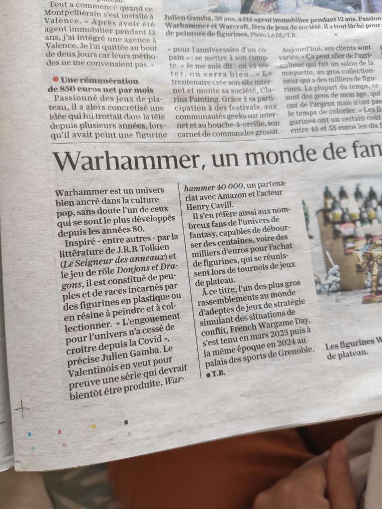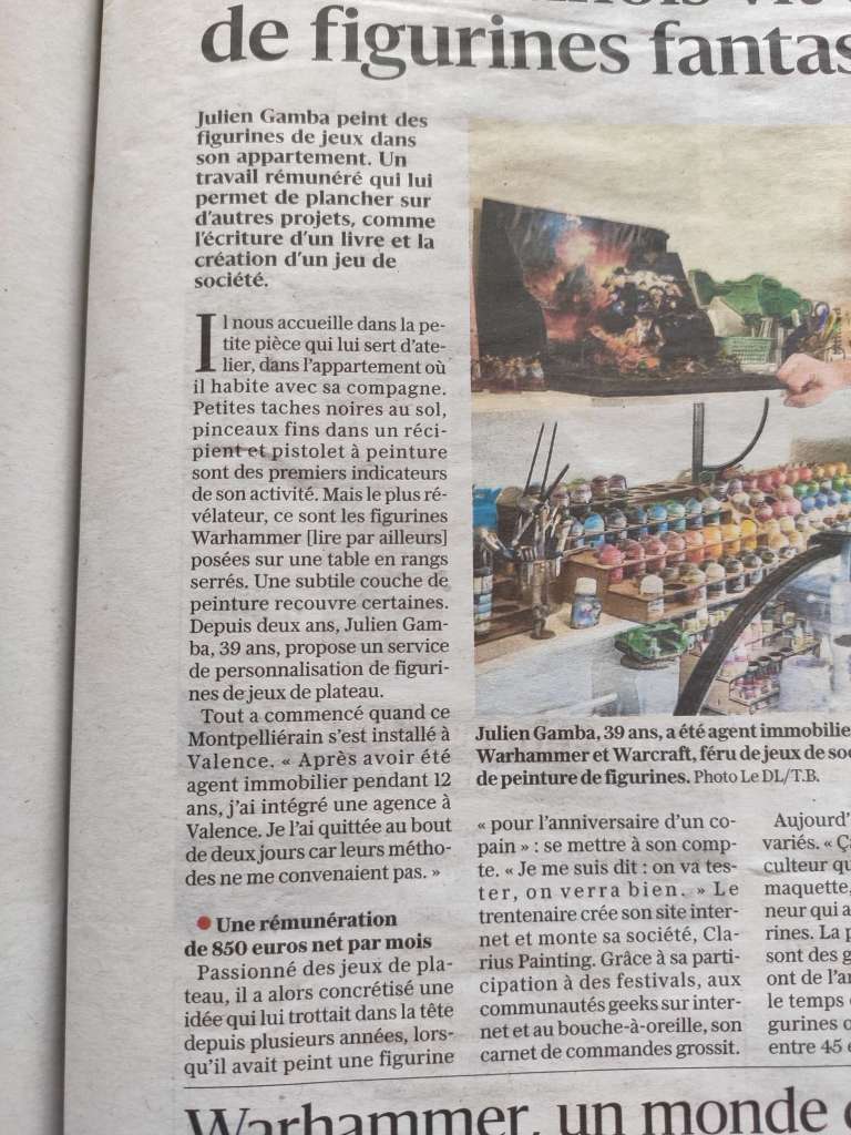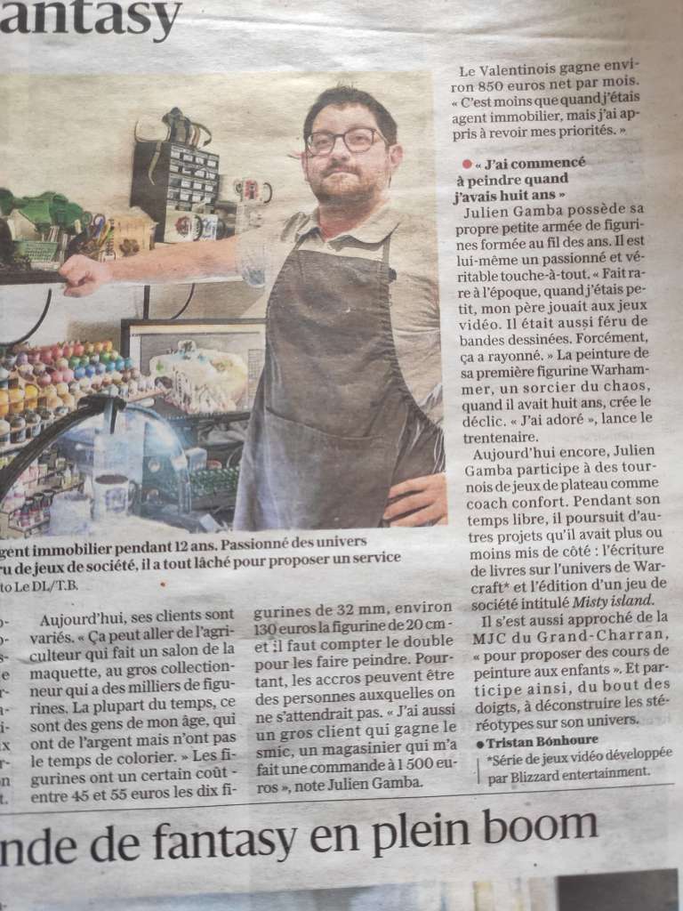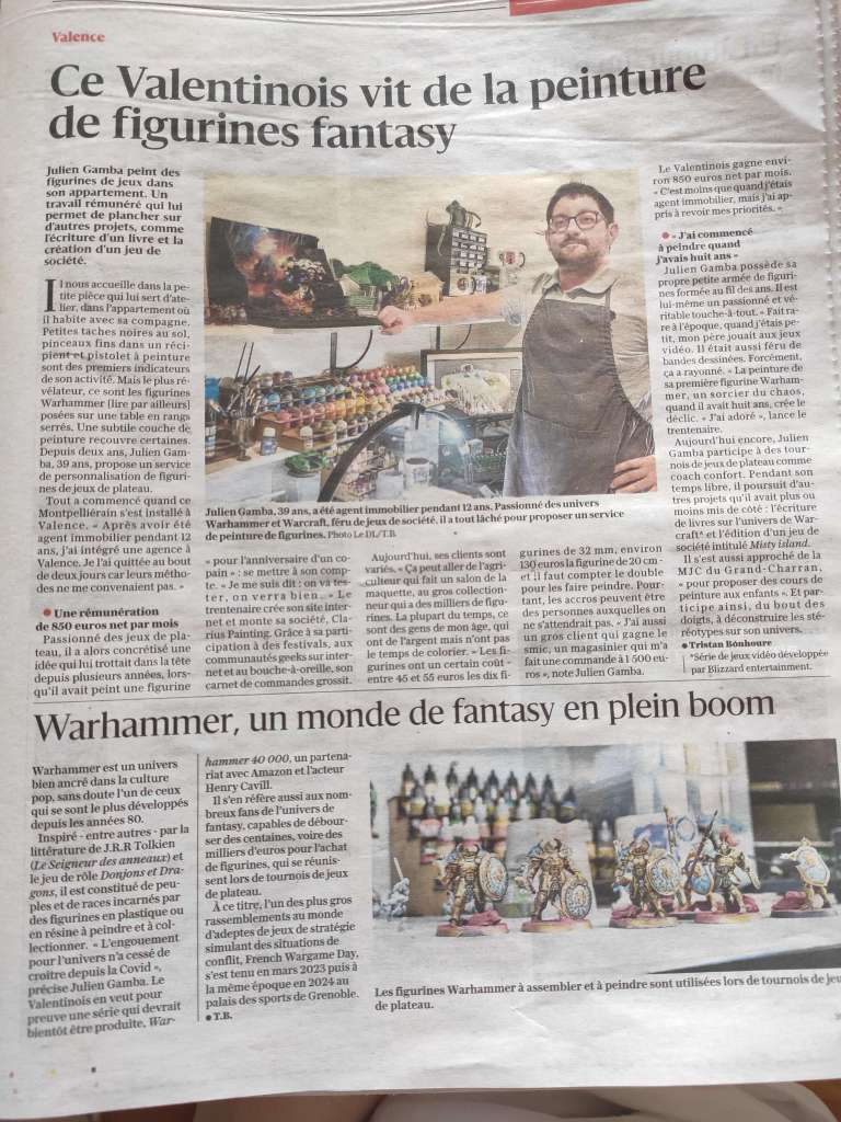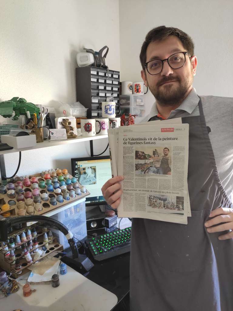 Tristan Bonhoure du Dauphiné Libéré Drôme-Ardèche est venu me voir dans mon atelier pour un entretien au sujet de mon activité professionnelle. Rencontré lors du Festival du Jeu de Valence 2024 lorsqu’il couvrait l’évènement, il est venu à mon stand pour discuter du pôle figurine où je tenais mon stand d’exposition et les initiations peinture. Etonné par mon métier, il m’a proposé de rédiger un article sur mon activité.