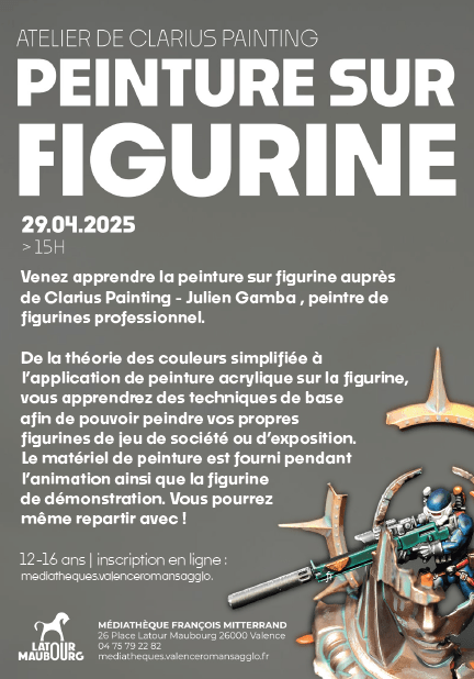 Le 29 Avril 2025 j’ai eu le plaisir d’animer une initiation de Peinture sur Figurine à la Médiathèque Latour-Maubourg (https://mediatheques.valenceromansagglo.fr/) auprès d’un public d’adolescent (12-16 ans).