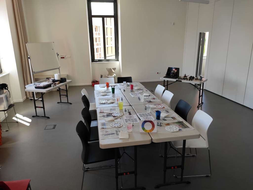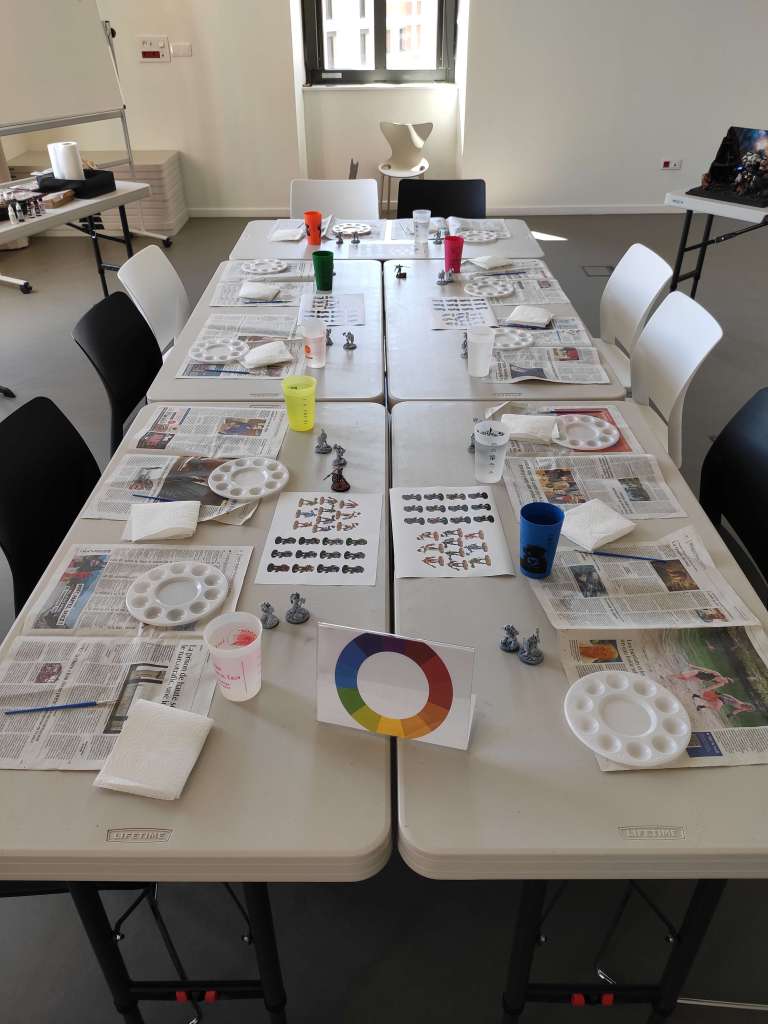 6 jeunes stagiaires étaient présents et ont pu peindre des figurines pour la première fois. Les techniques apprises ont été bien assimilées et les élèves ont pu s’exprimer avec leur pinceaux. Nous avons vu la pose des couches de bases, la technique d’assombrissement du lavis, ainsi que les éclaircies par brossage. J’ai même pu leur apprendre à appliquer des pigments en poudre sur les socles pour un effet poussiéreux rapide à faire et très satisfaisant 🙂