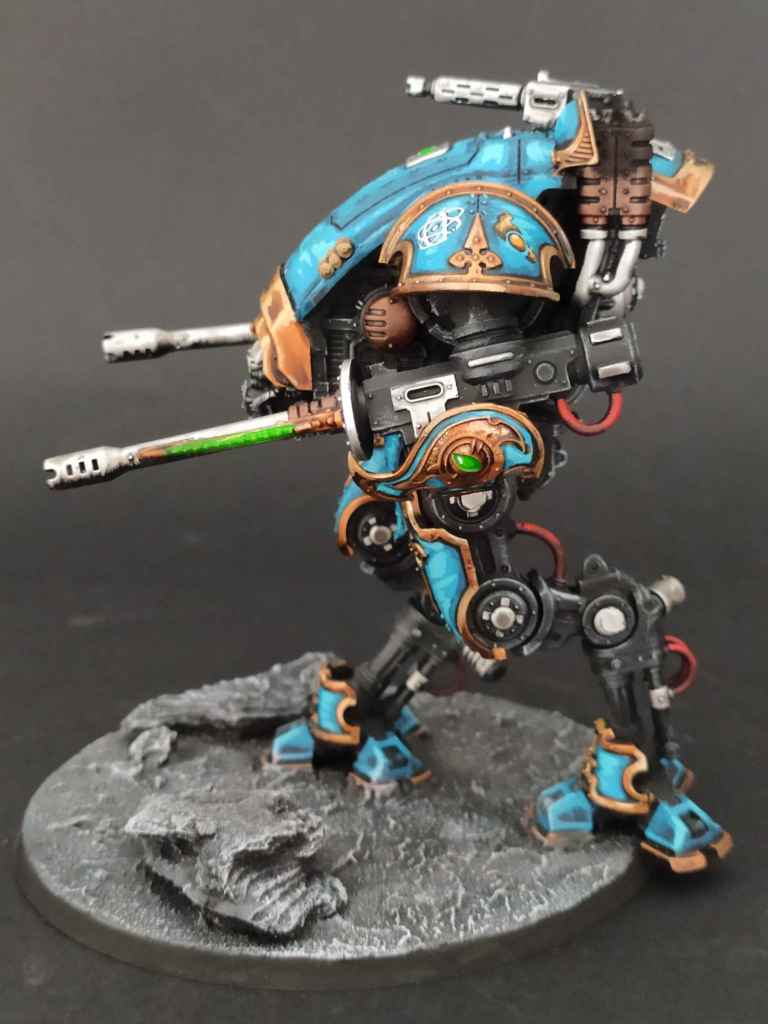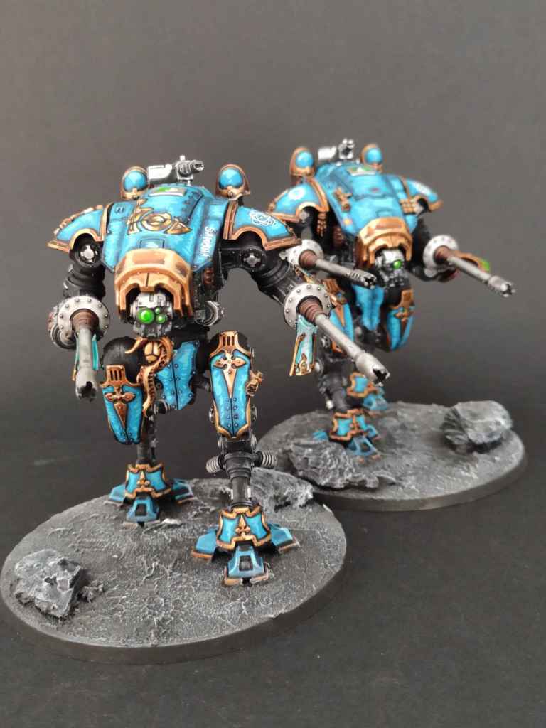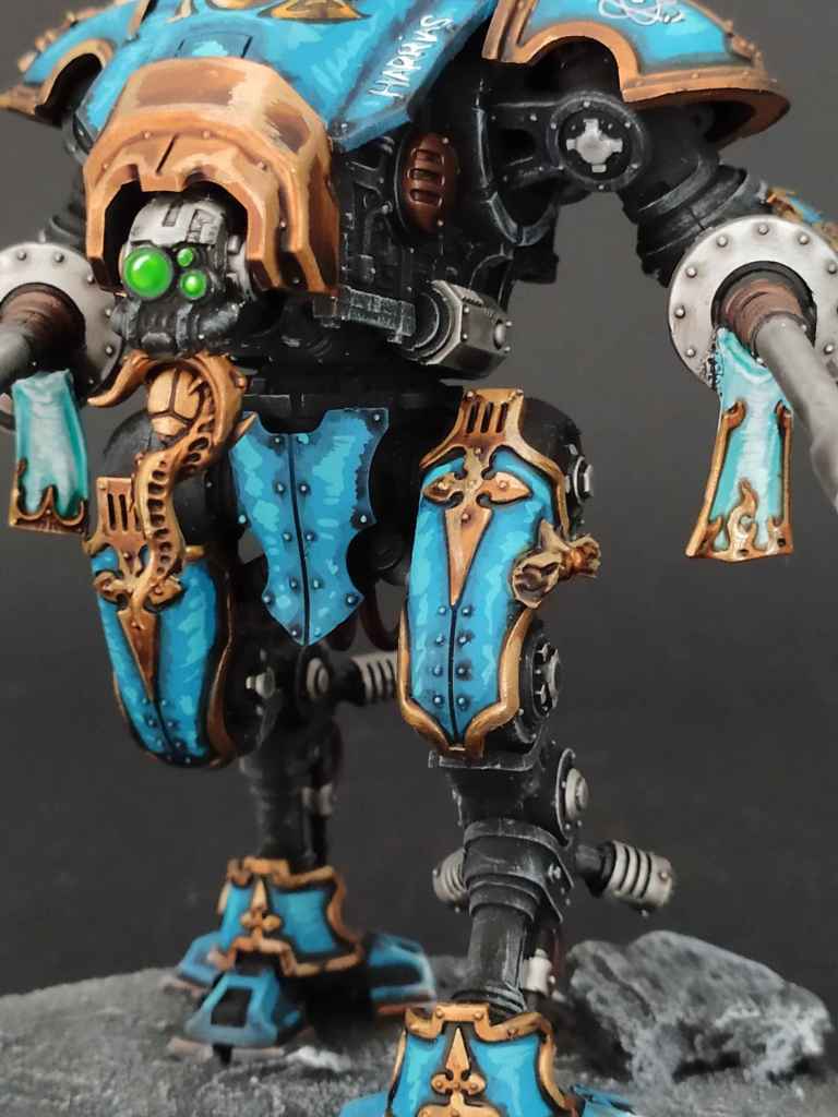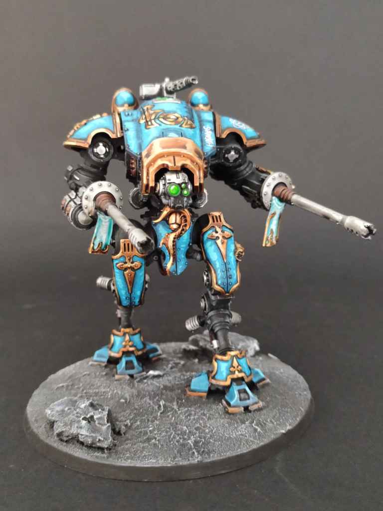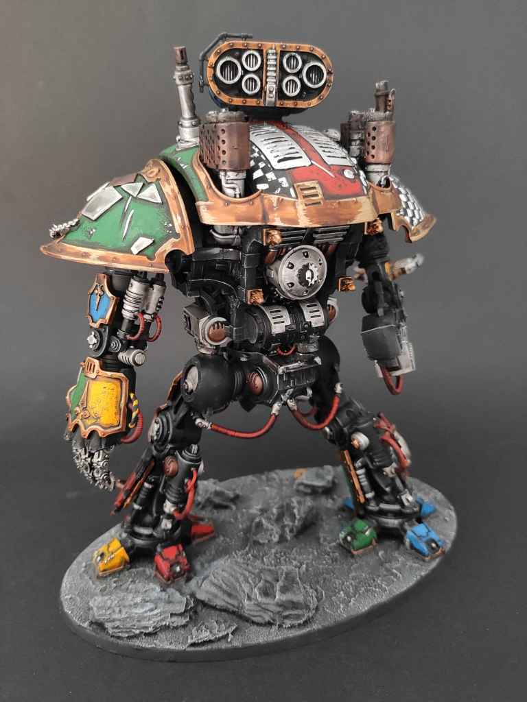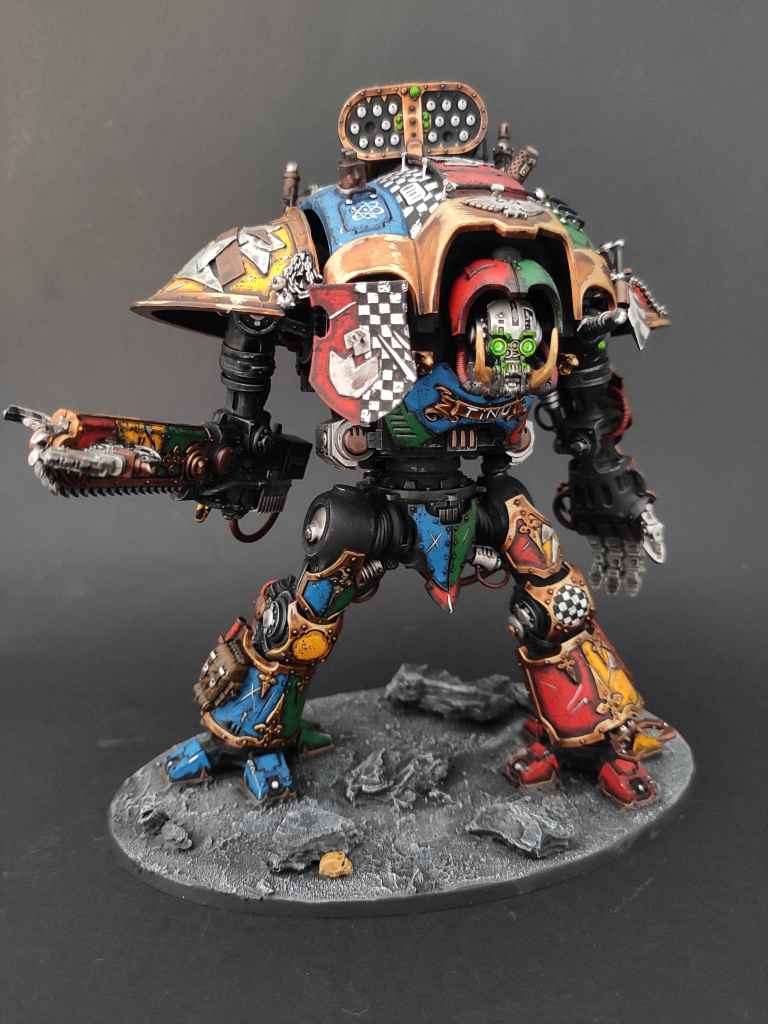 Récemment, j’ai eu une commande un peu spéciale ^^ une armée d’Imperial Knight pour le jeu Warhammer 40000. Elle était spéciale dans le schéma de couleur choisi. Chacune des figurines devait être dans le style d’une des factions jouées par un des membres de son équipe compétitive 40K.