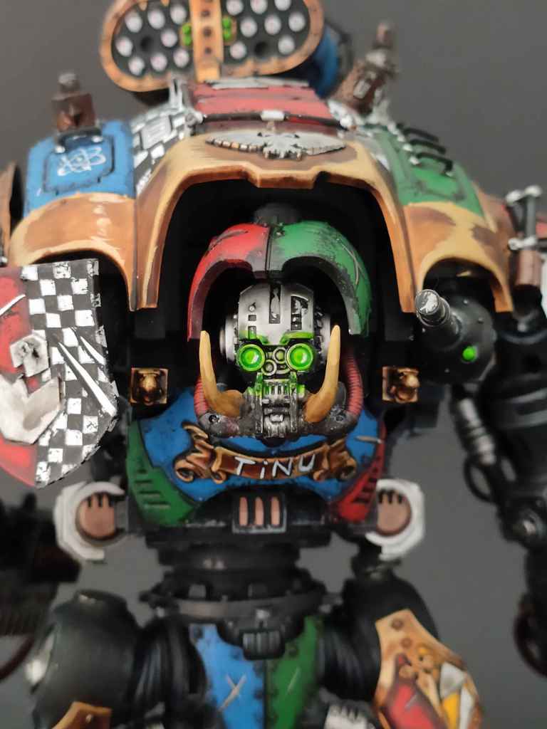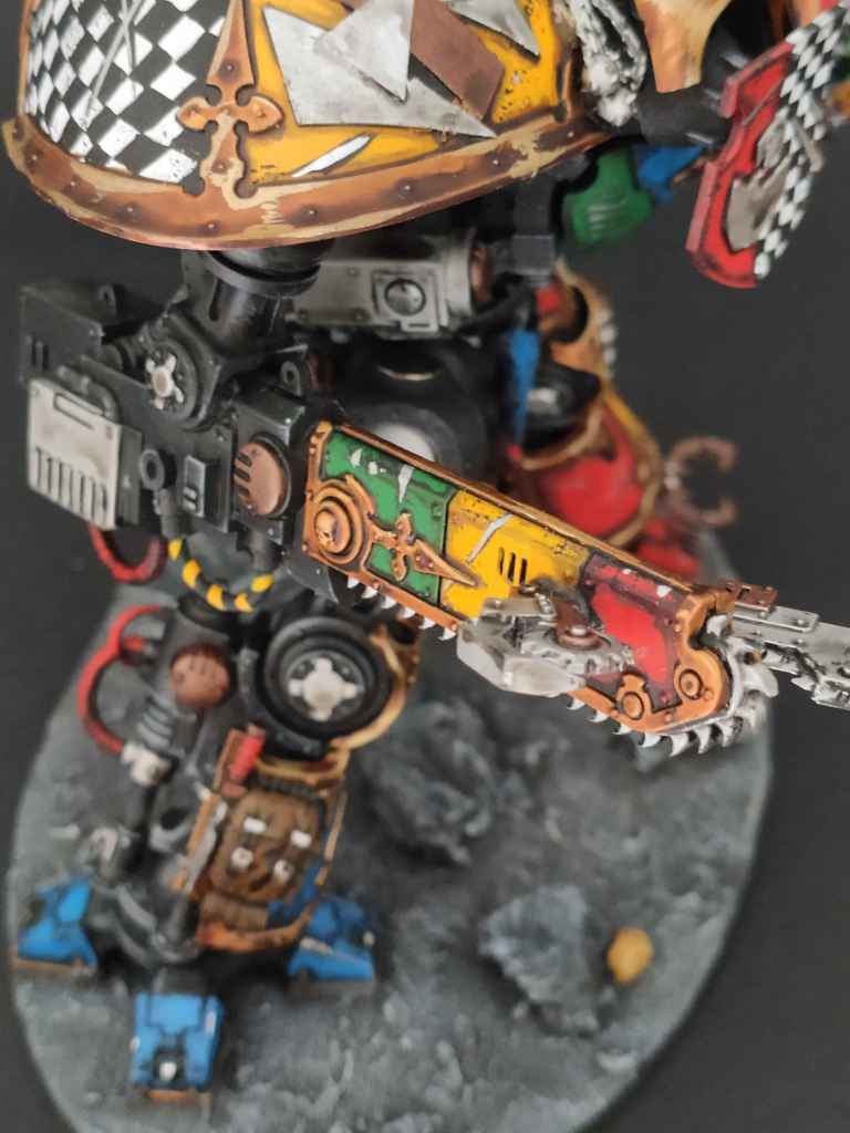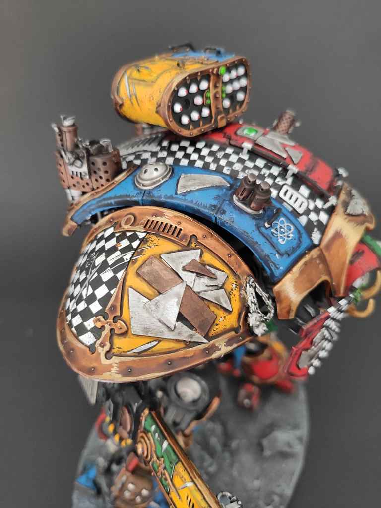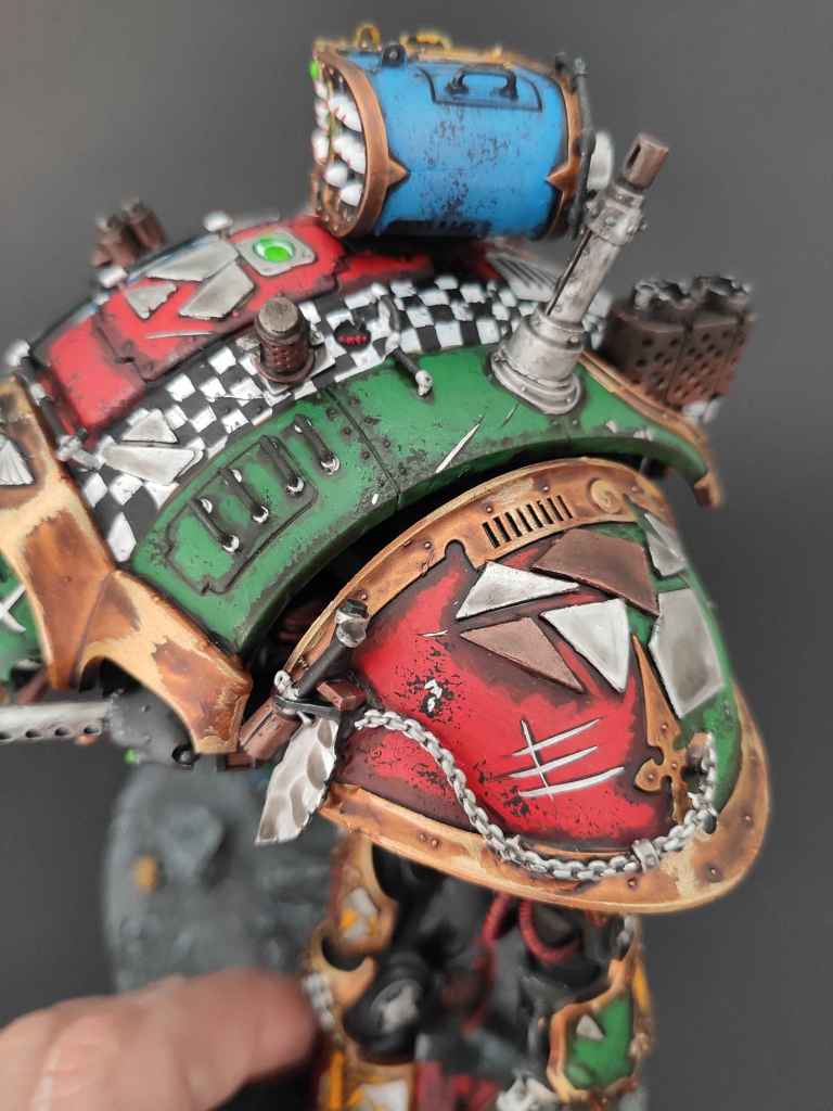 Cet Imperial Knight a quant à lui était peints et customisé à l’image des Orks ! Cela s’est d’abords traduit par l’application de bitz Orks par-ci par-là, la pose de « plaques de métal » par endroits pour simuler l’accumulation de couches de protection et la pose de défense au niveau du casque. Egalement, la peinture bariolée et multicolore ainsi que les damiers noir et blanc sont typiques de la culture Ork. Et la petite finition : un crâne Ork sur le socle ^^