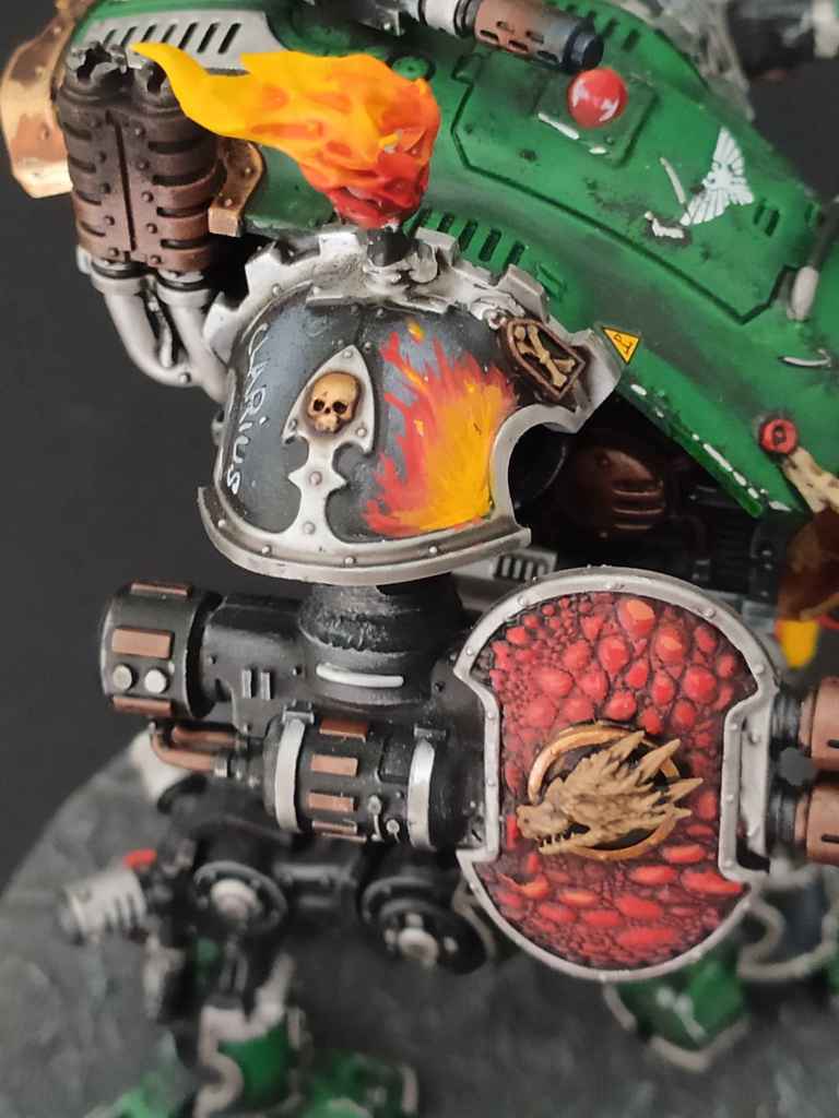 Ce duo d’Armigères m’a particulièrement fait plaisir à peindre puisque c’est le thème des Space Marines Salamanders, ma faction de coeur 🙂 Pour ce faire, j’ai rajouté des bitz de Salamanders que j’utilise en général pour mes Space Marines. Notamment les flambeaux et les boucliers à l’emblème de salamandre. Au-delà du vert caractéristique des Salamanders, les freehand de flammes sont une des clés visuelles de ce chapitre Space Marines.
