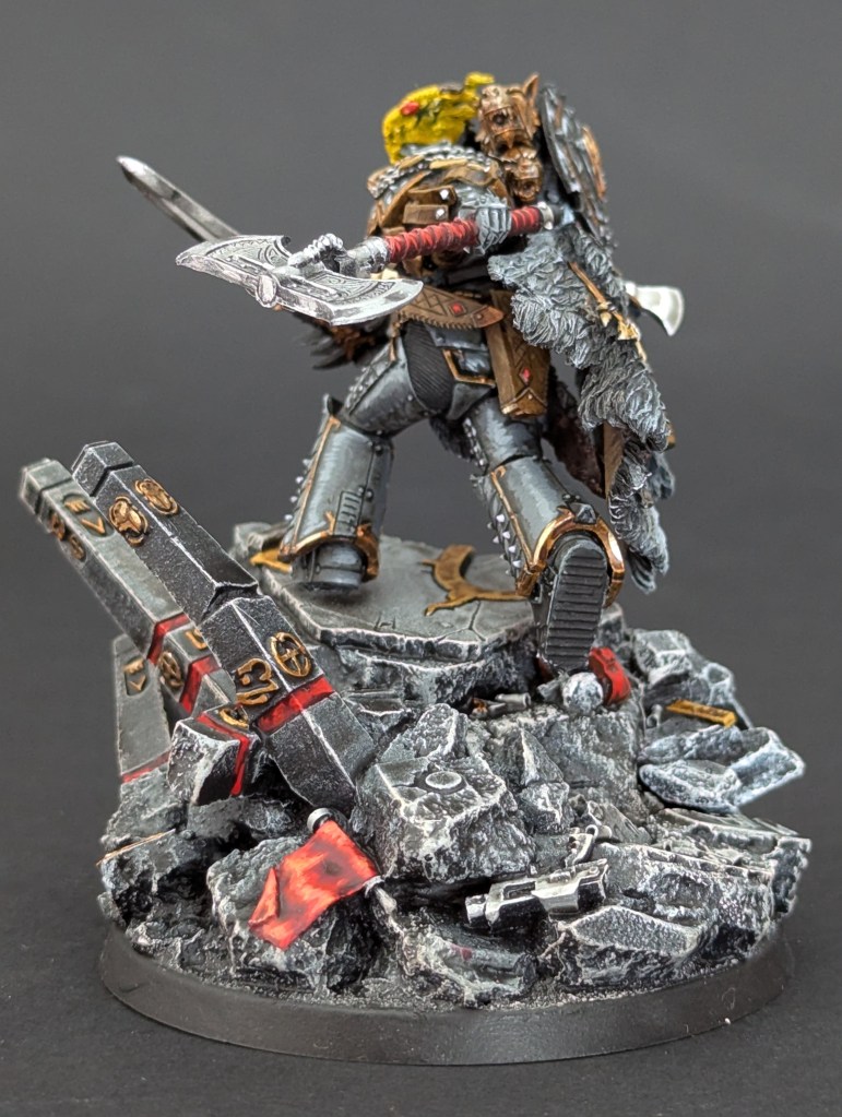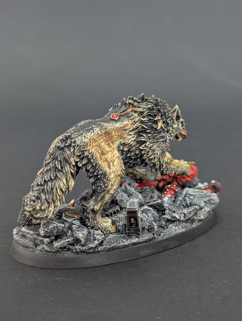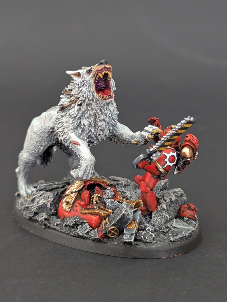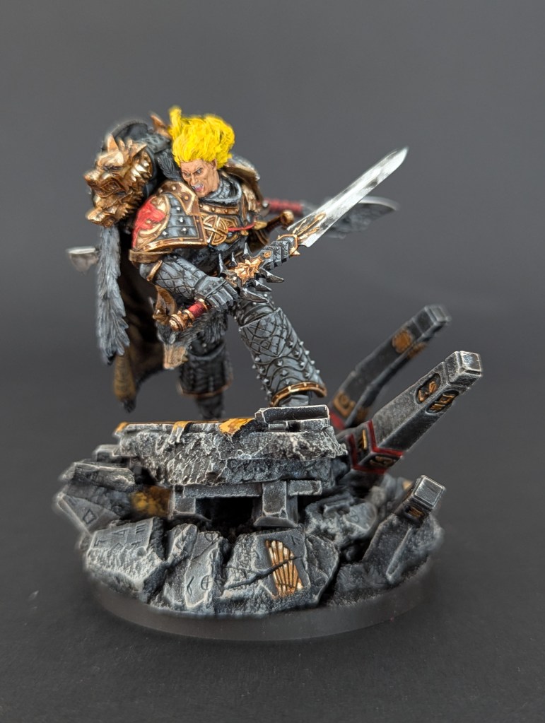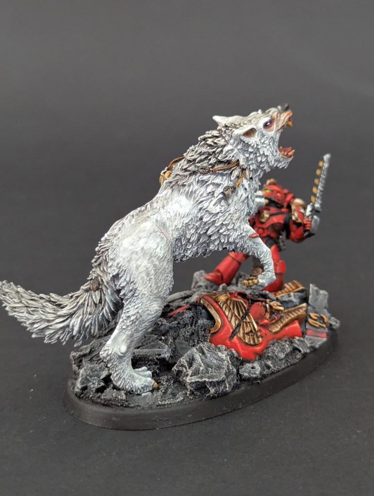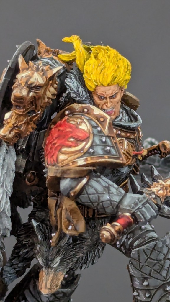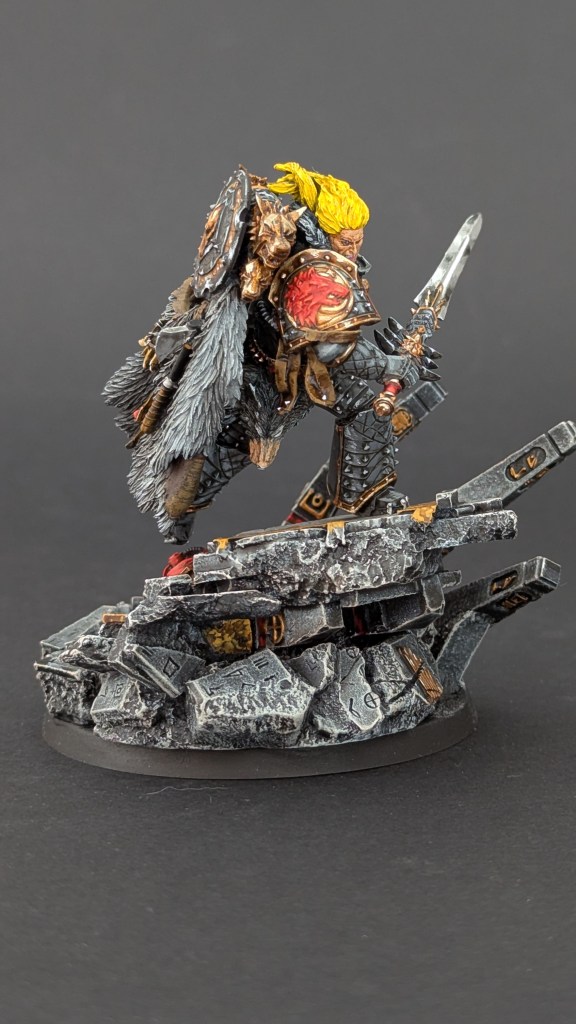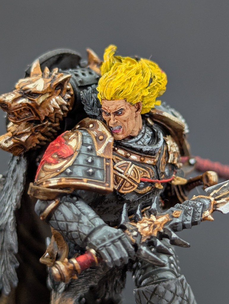 Voici Leman Russ, Primarque des Space Wolves ! En réalité, et pour le moment, il fait partie de l’univers de Warhammer 30000 mais peut-être reviendra-t-il plus tôt que prévu ? ^^ J’espère que cette peinture vous plaira !