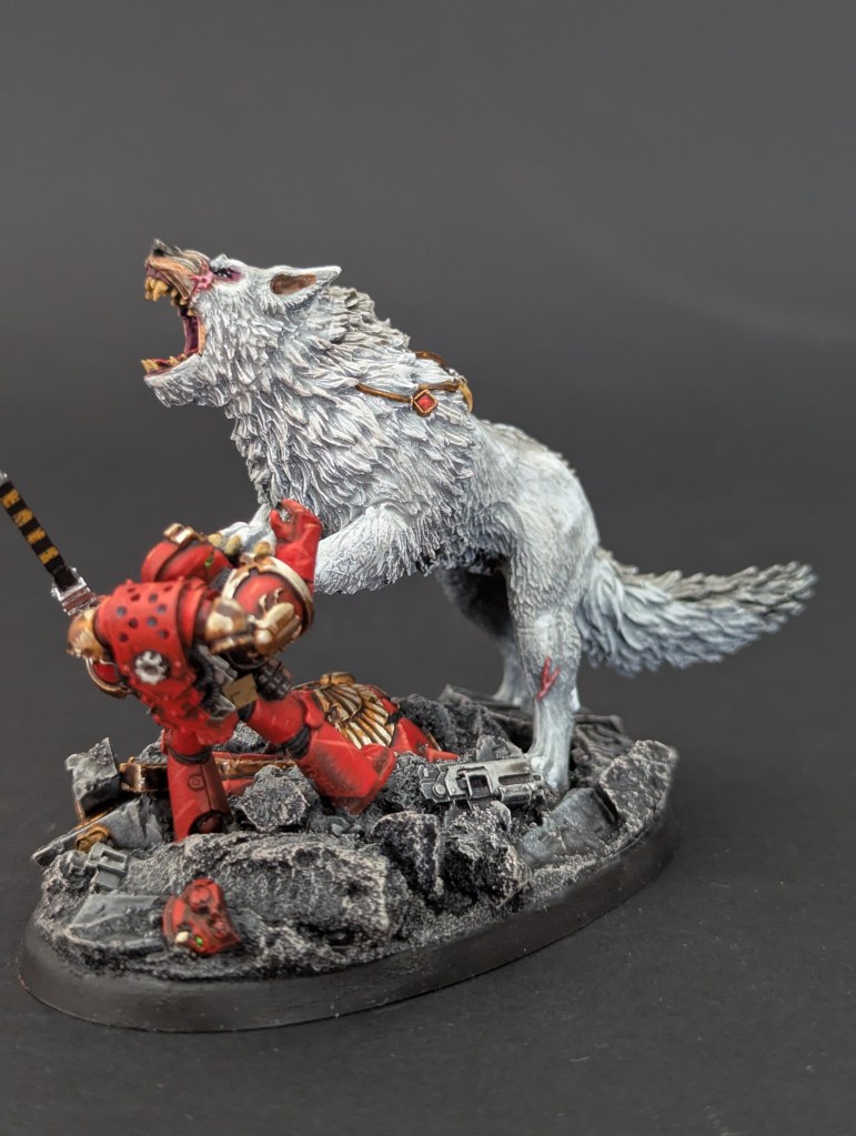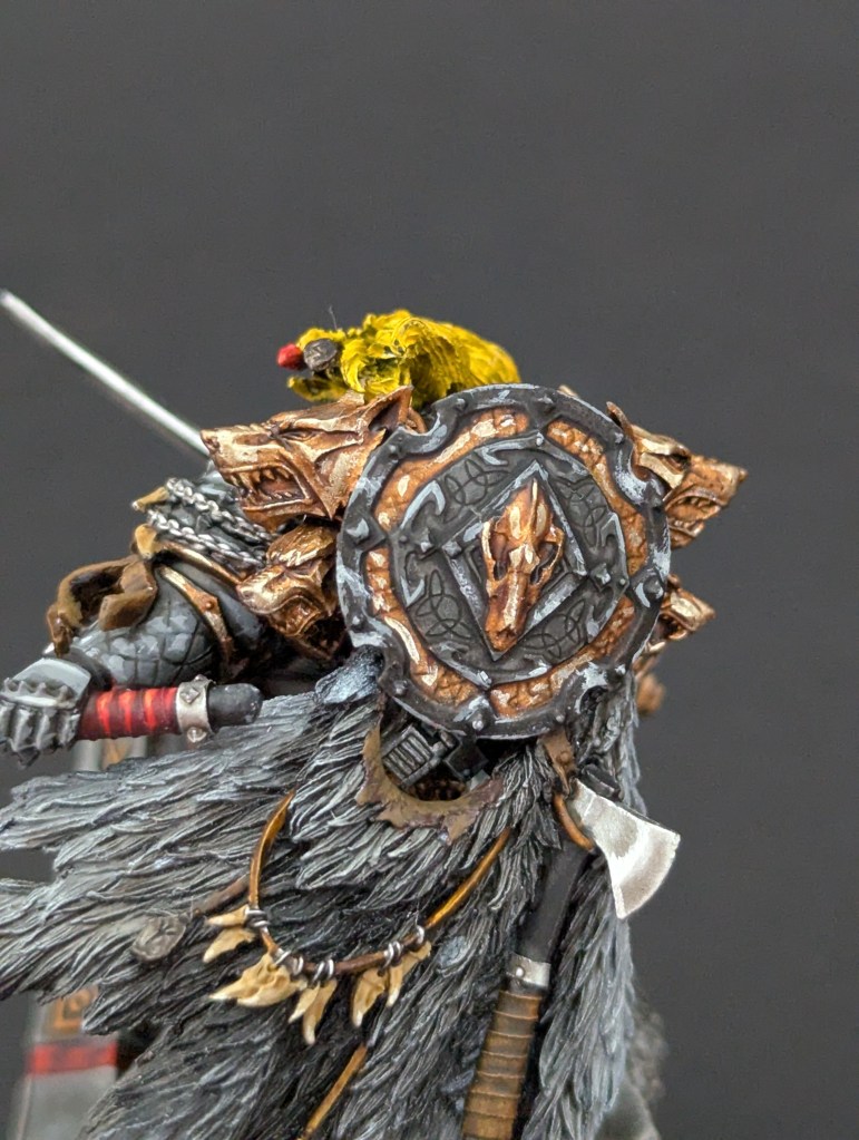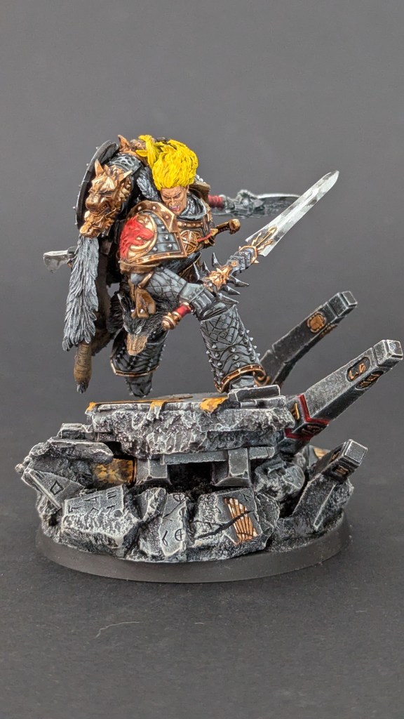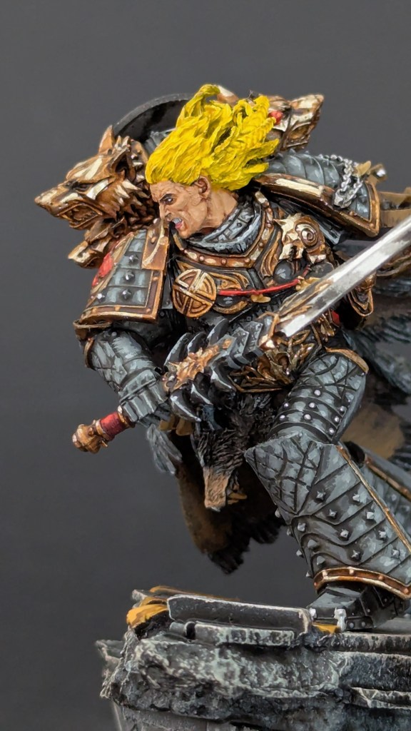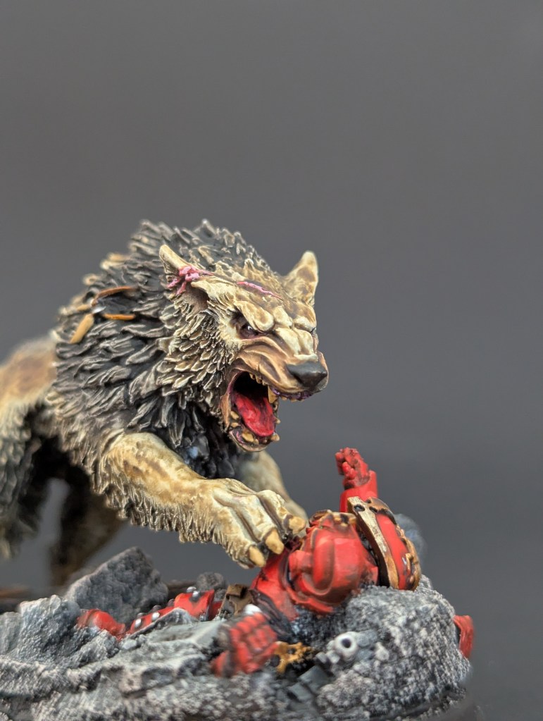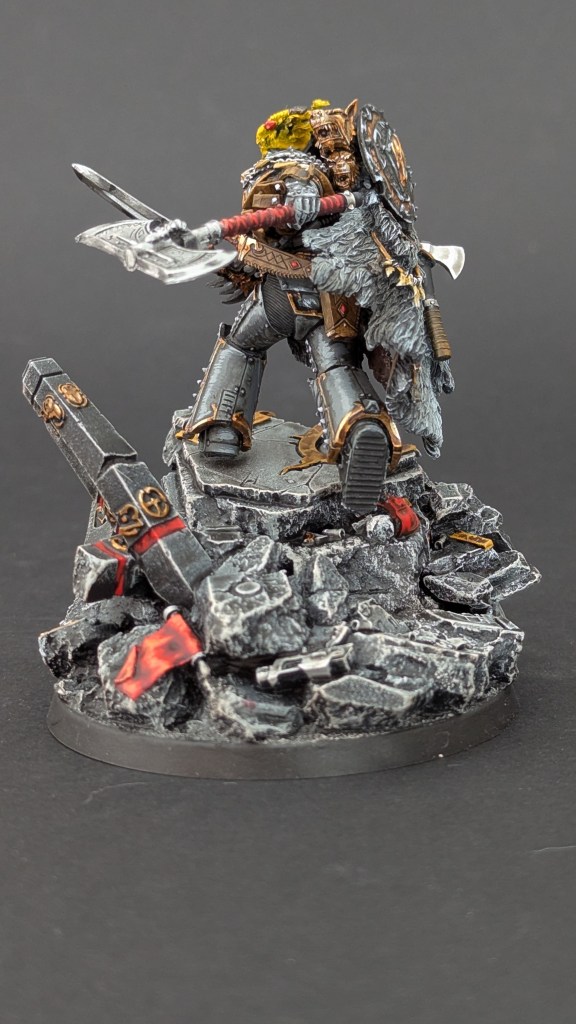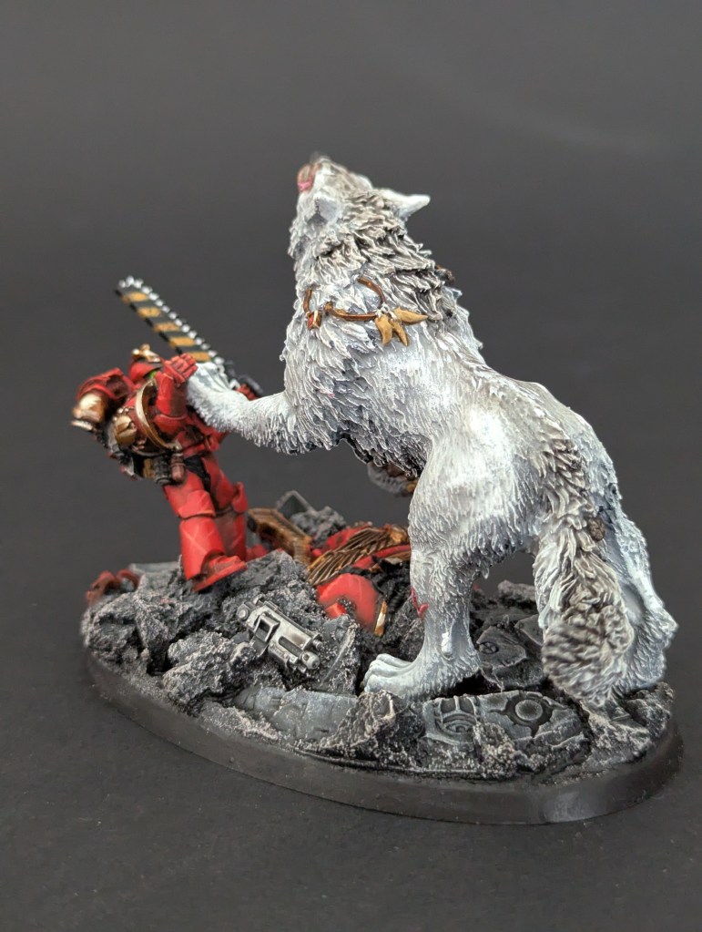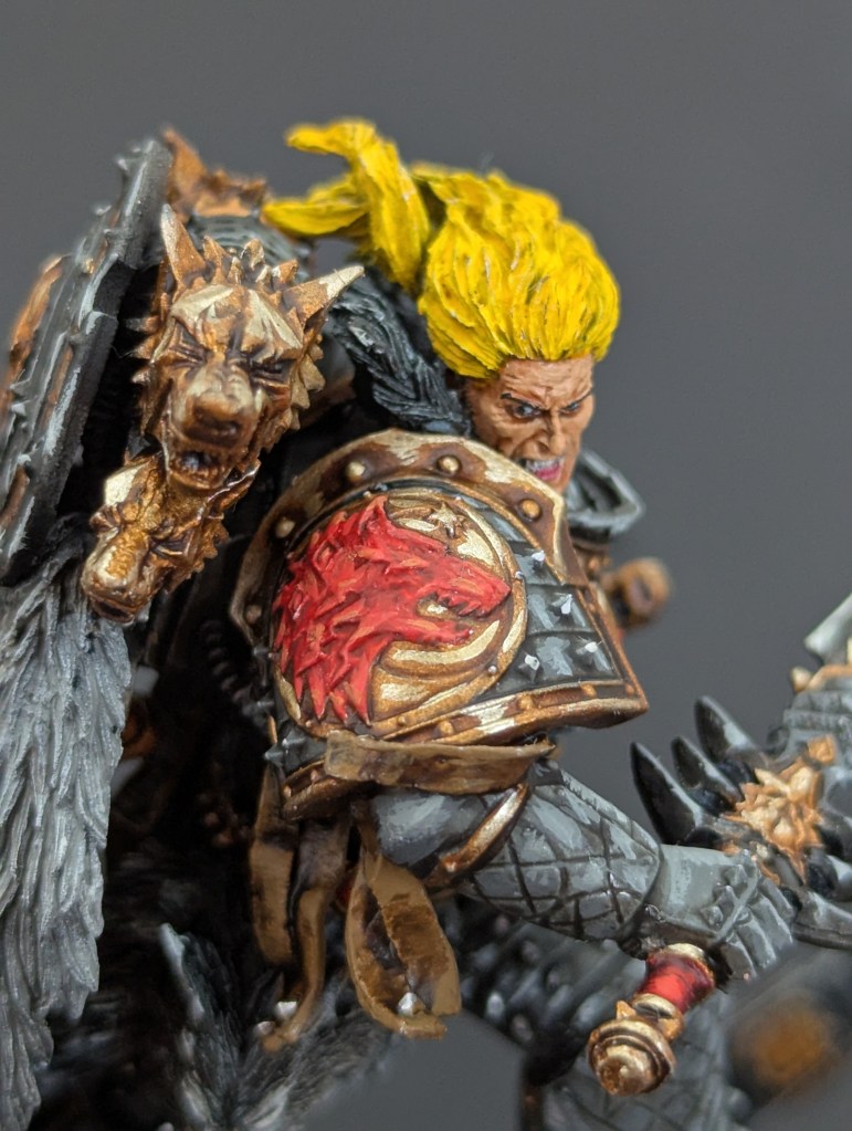 Voici Leman Russ, Primarque des Space Wolves ! En réalité, et pour le moment, il fait partie de l’univers de Warhammer 30000 mais peut-être reviendra-t-il plus tôt que prévu ? ^^ J’espère que cette peinture vous plaira !