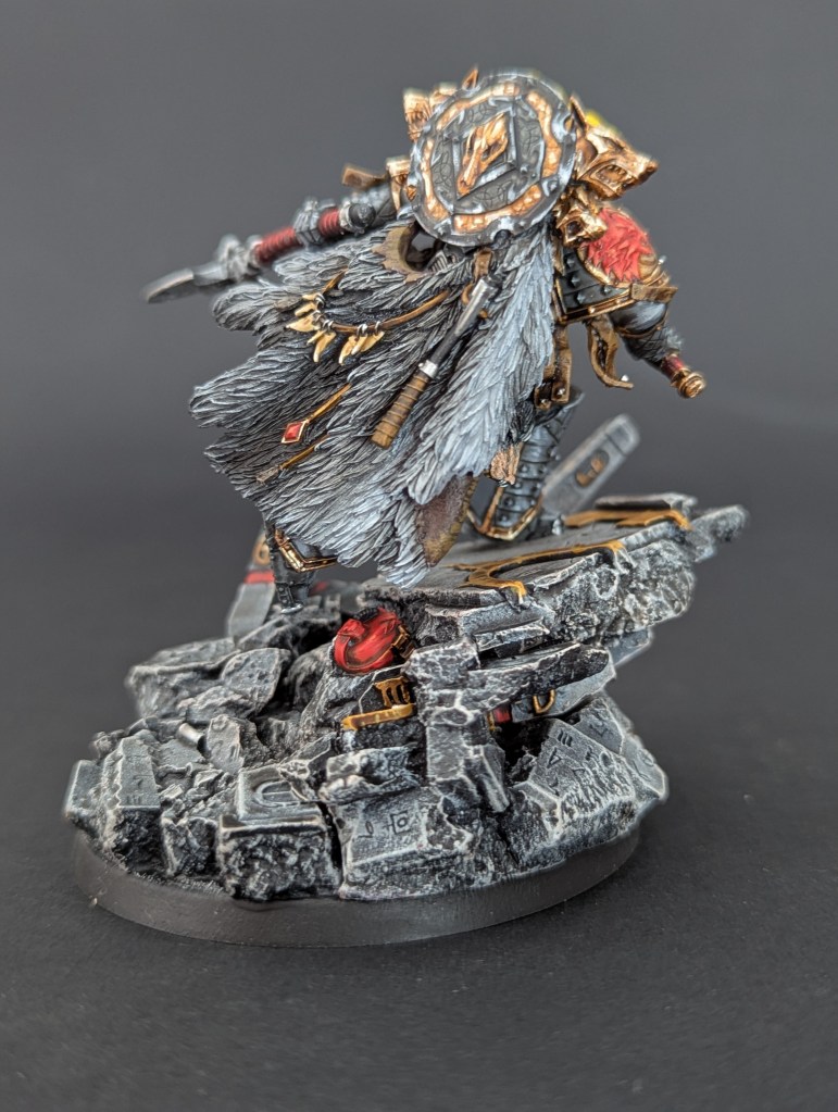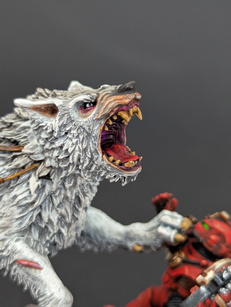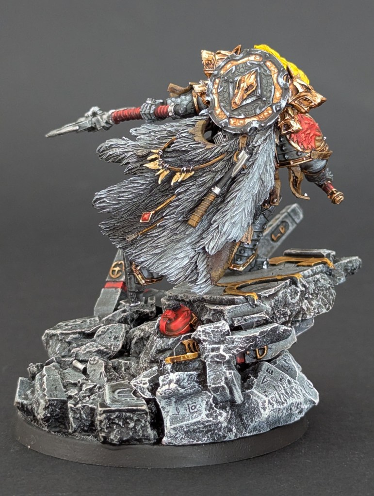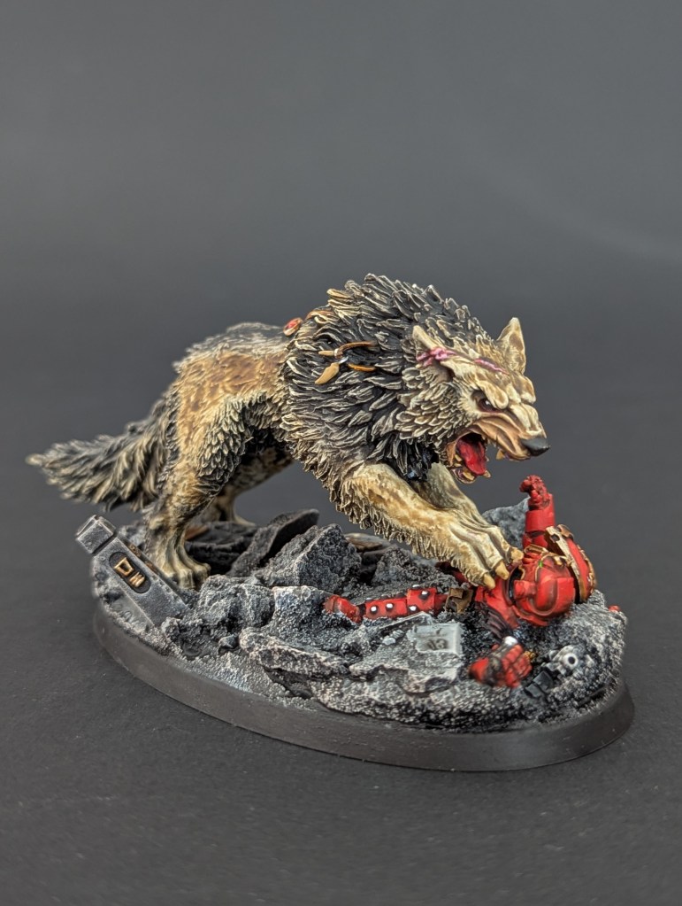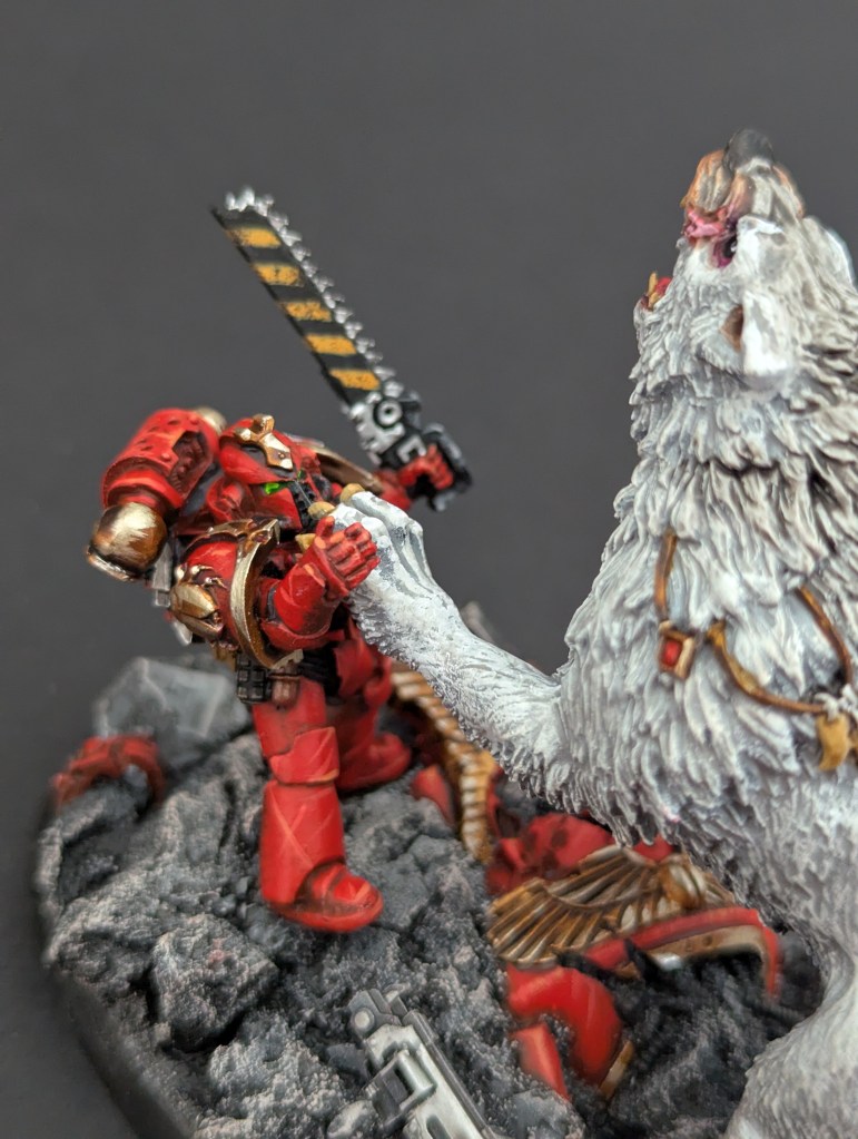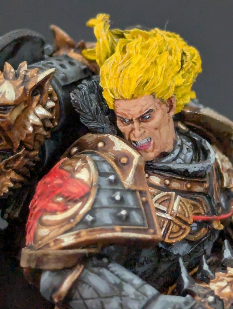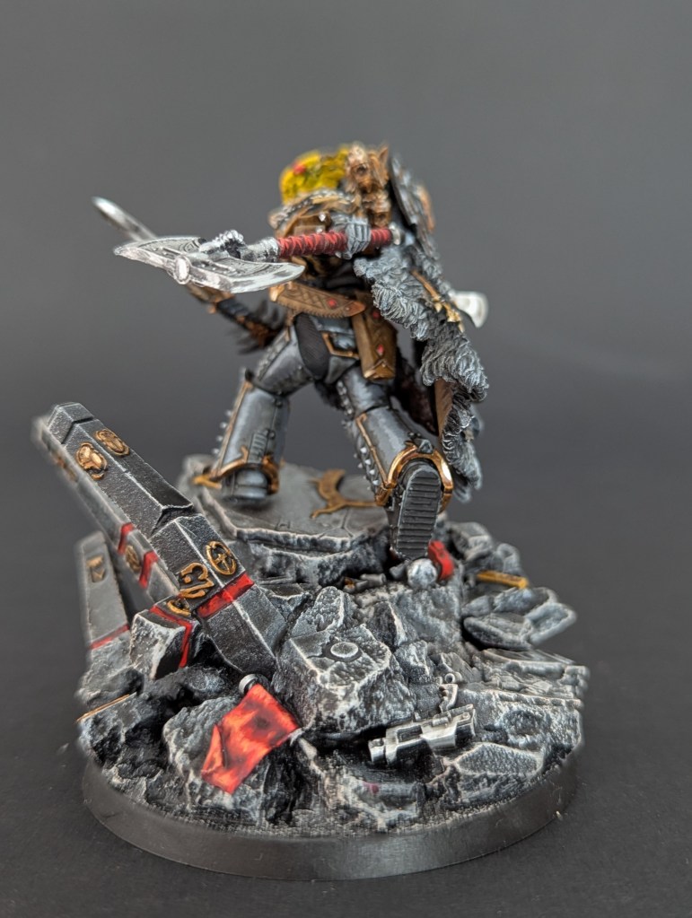 Voici Leman Russ, Primarque des Space Wolves ! En réalité, et pour le moment, il fait partie de l’univers de Warhammer 30000 mais peut-être reviendra-t-il plus tôt que prévu ? ^^ J’espère que cette peinture vous plaira !