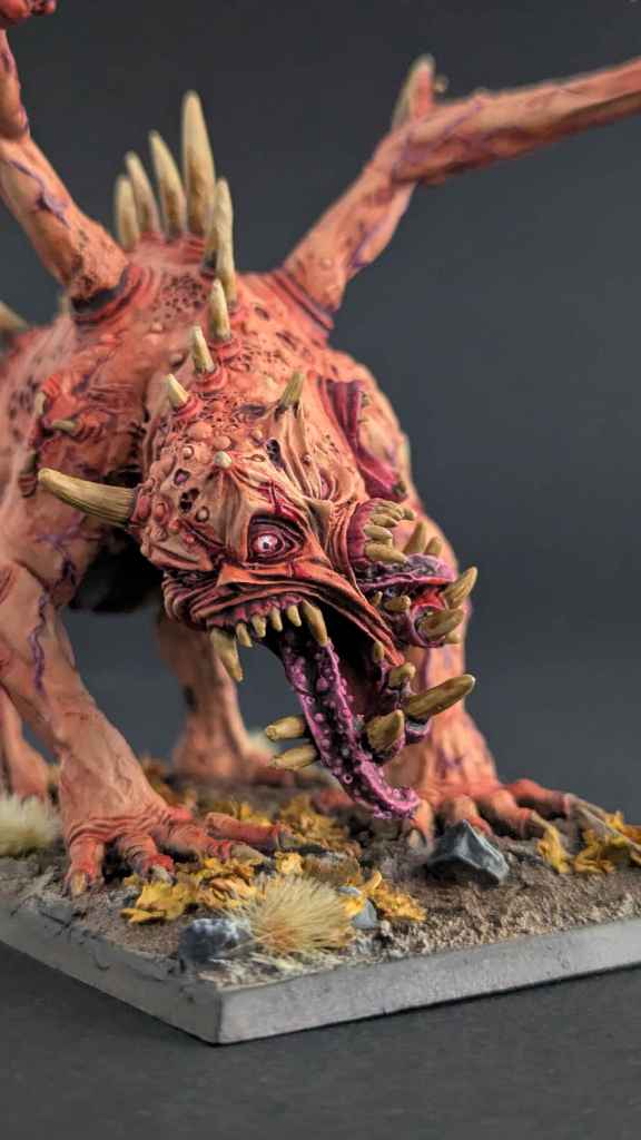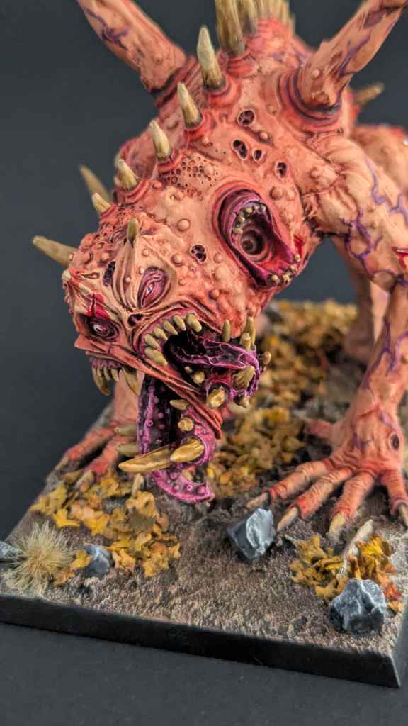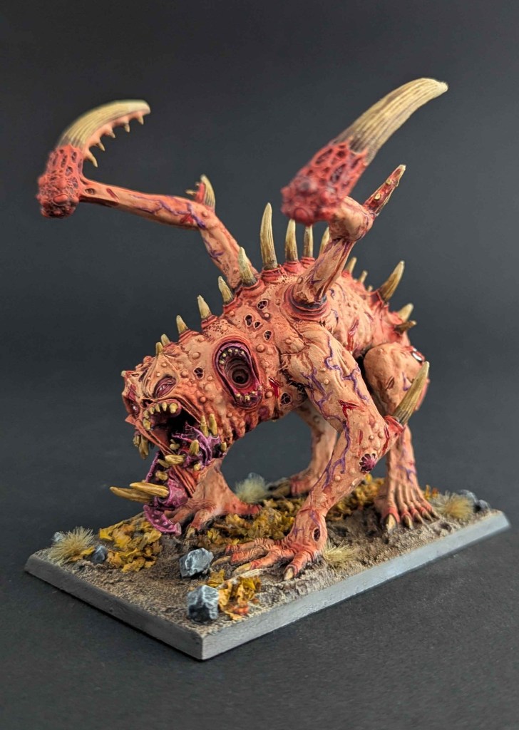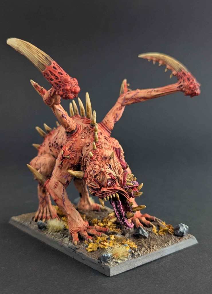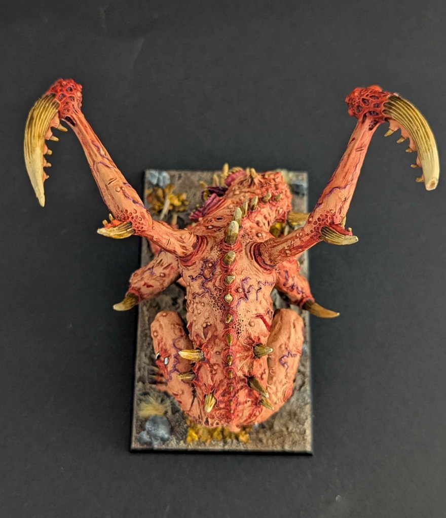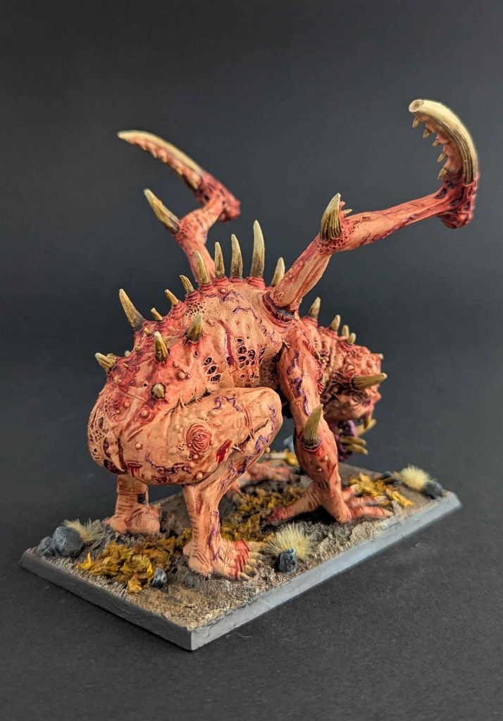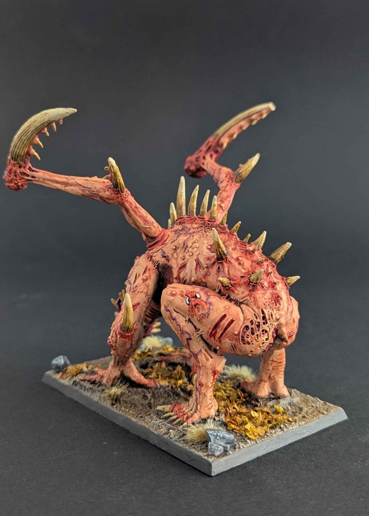 Un grand Rejeton du Chaos des Guerriers du Chaos, un kit « expert » de chez Games Workshop, pour le jeu The Old World. De prime abord, je n’aimais pas beaucoup la figurine mais je dois avouer qu’une fois peinte, elle a une certaine présence sur table !